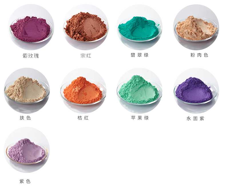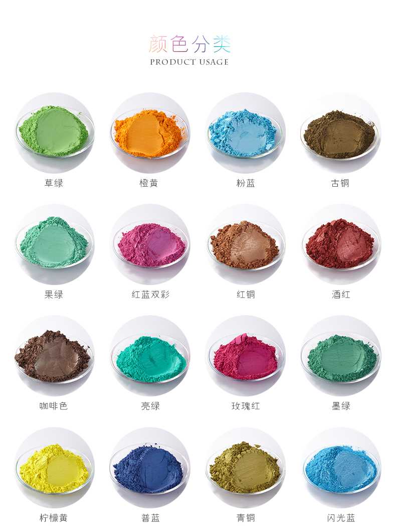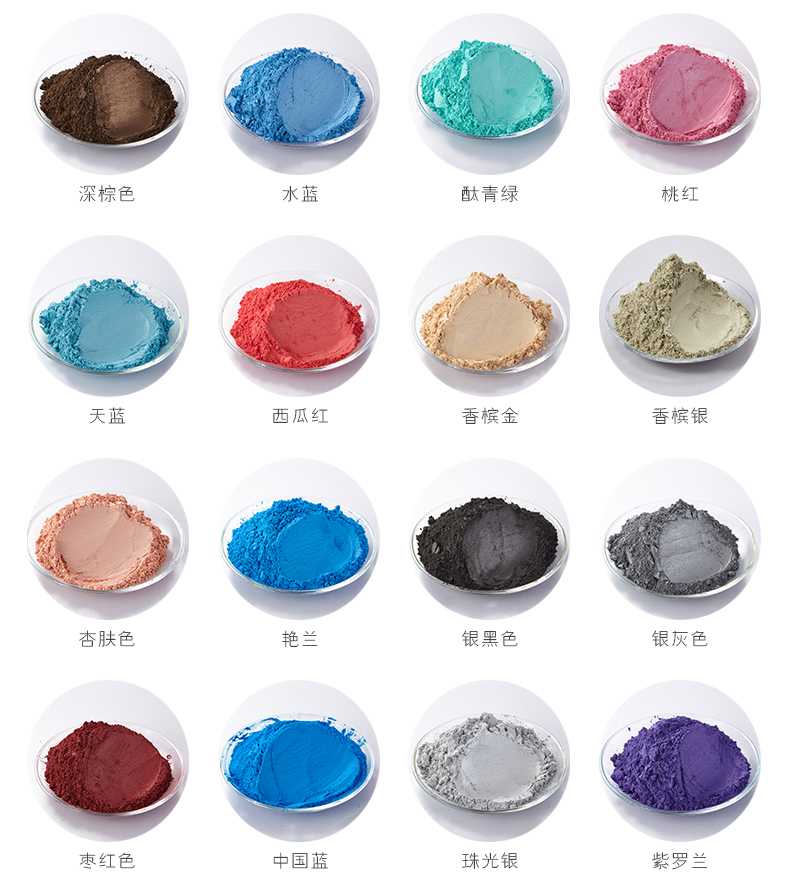 (5)雙色珠光粉系列:雙色系列珠光顏料是在云母表面直接覆蓋一層氧化鐵薄膜根據氧化鐵涂層厚度的不同生產古銅、紅棕、酒紅、紫紅、紅綠等干涉色,色彩鮮艷、光澤度強、著色力大,盡管其本身是非金屬,卻能產生金屬光澤。